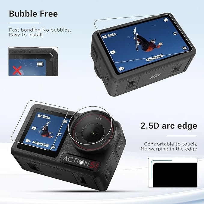 • 【PERFECT FIT FOR YOUR ACTION CAMERA】: Specially designed for the Osmo Action 5 Pro, these premium screen protectors are custom-cut to match each dimension of your camera, ensuring complete compatibility and unobstructed performance. This all-inclusive action camera accessories contains a front LCD protector, lens protector, back screen protector, silicone lens cap, and cleaning cloth to safeguard your camera from scratches, smudges, and dust.