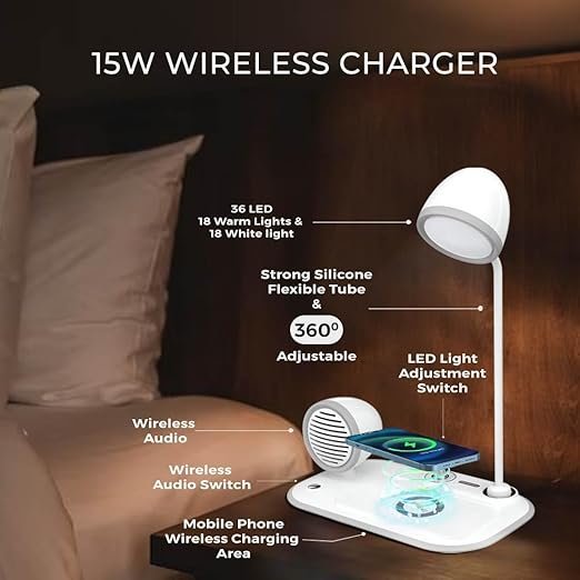 | Special Feature | 3 in 1 Desk Lamp with 15w Wireless Charger and Bluetooth Speaker & Mic for Calls |