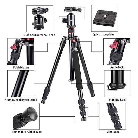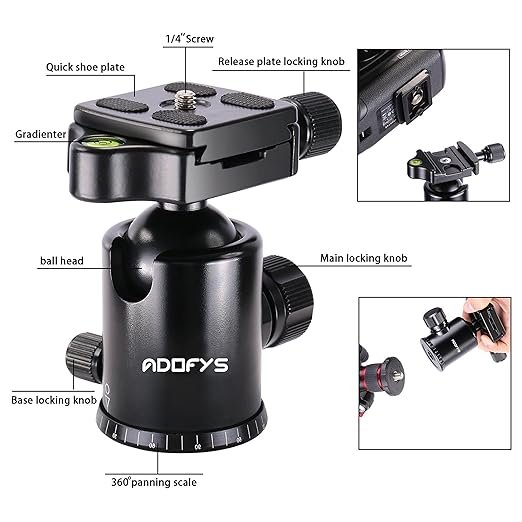 • 【Panoramic Ball Head】–360° panoramic rotating, 90° flip and large angle tilt adjusting make shooting much easier in multi-angle, quick loading plate and bubble level let installation quicker.